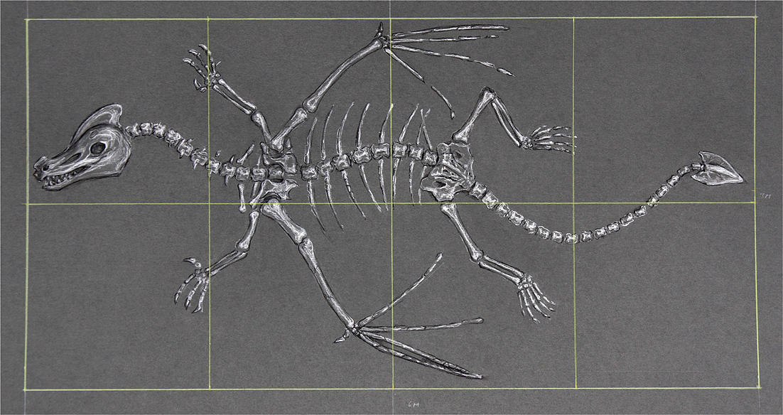 In chalk and charcoal on grey card. 60cm x 30cm with 15cm squares shown